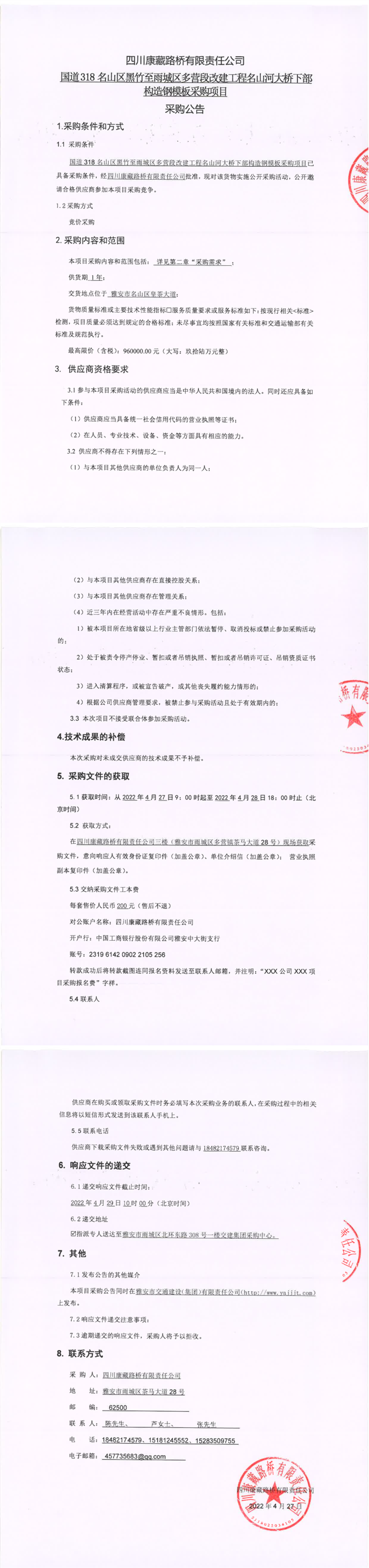 四川康藏路桥有限责任公司国道318名山区黑竹至雨城区多营段改建工程名山河大桥下部构造钢模板采购项目采购公告
