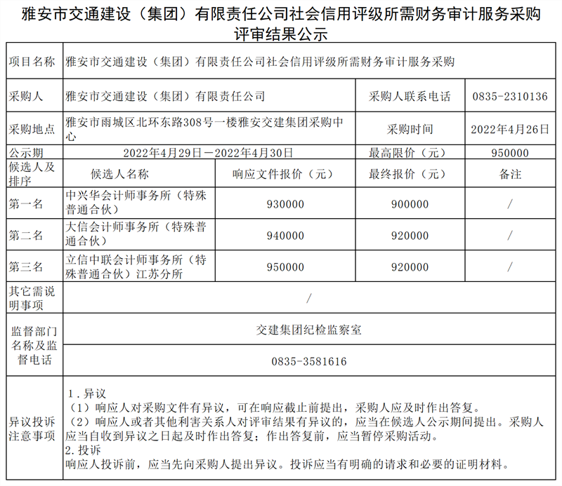 雅安市交通建设(集团)有限责任公司社会信用评级所需财务审计服务采购评审结果公示