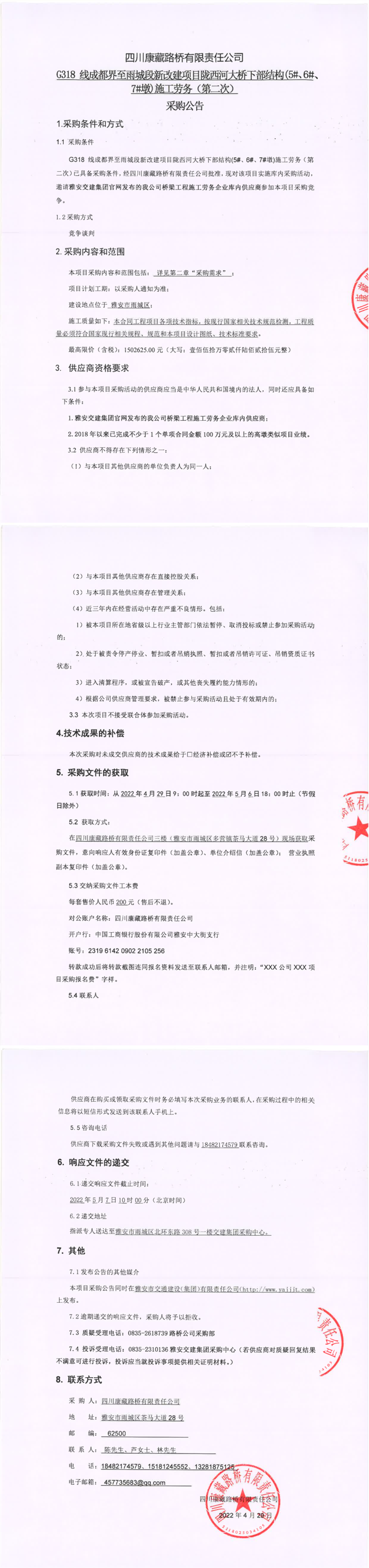 四川康藏路桥有限责任公司G318线成都界至雨城段新改建项目陇西河大桥下部结构(5#、6#、7#墩)施工劳务(第二次)采购公告