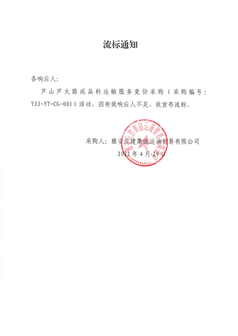 亿万先生MR集团运通贸易有限公司芦山芦太路成品料运输服务竞价采购流标通知