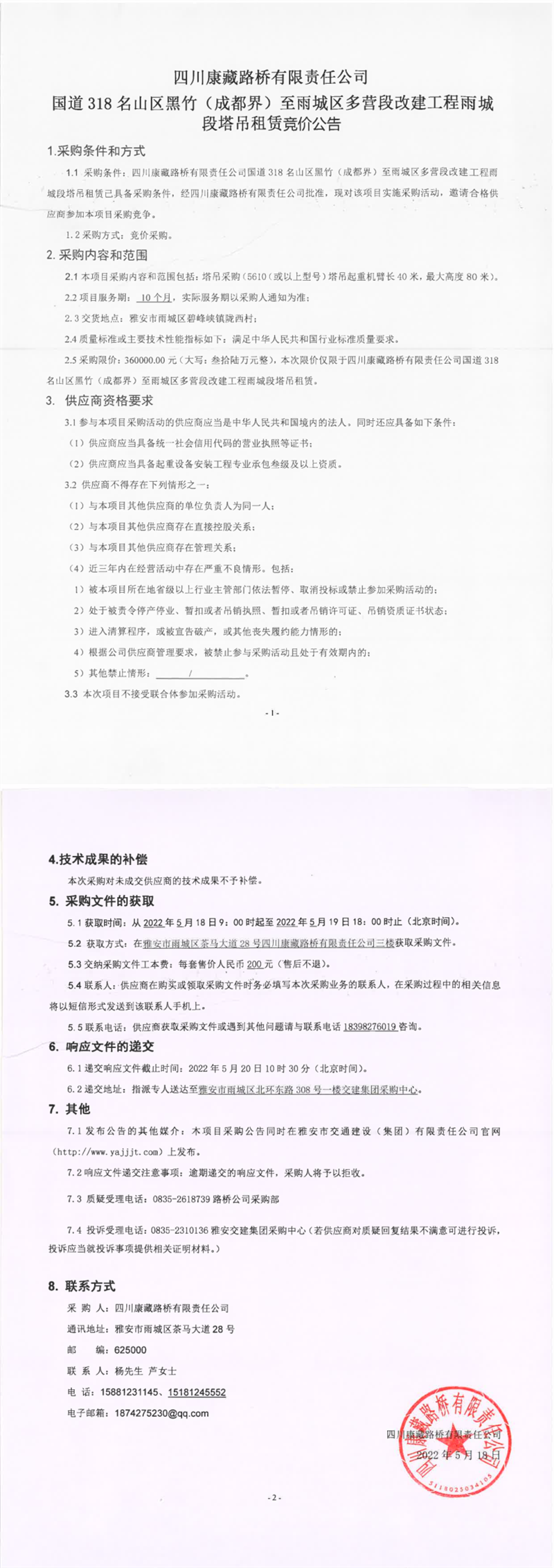 四川康藏路桥有限责任公司国道318名山区黑竹(成都界)至雨城区多营段改建工程雨城段塔吊租赁竞价公告