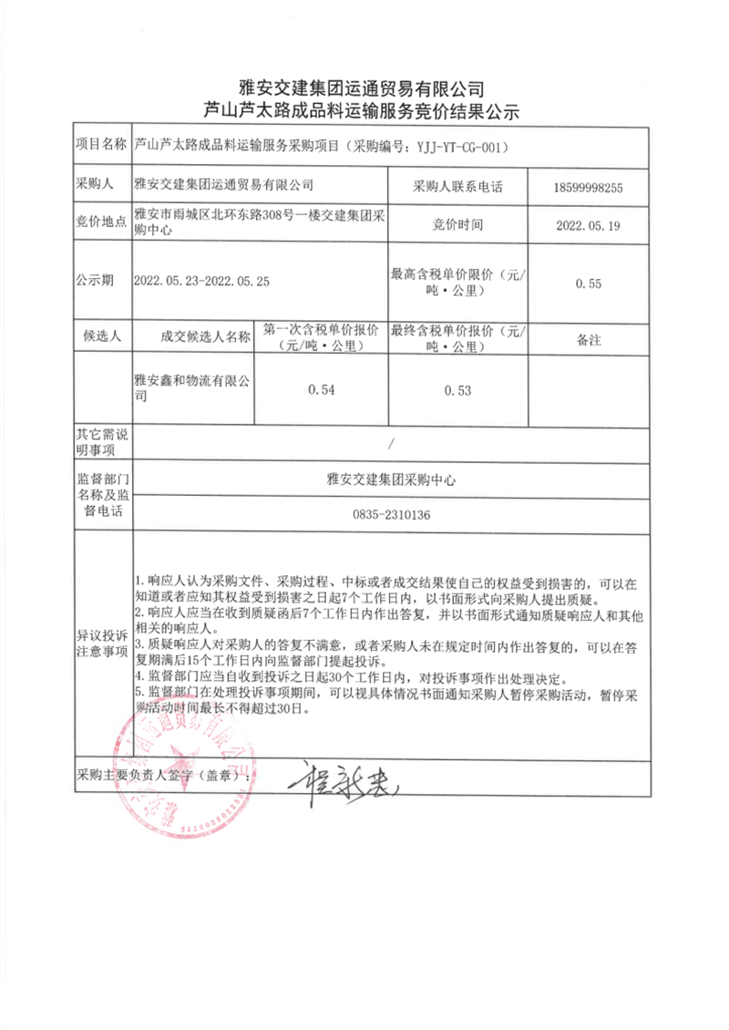 亿万先生MR集团运通贸易有限公司芦山芦太路成品料运输服务竞价结果公示