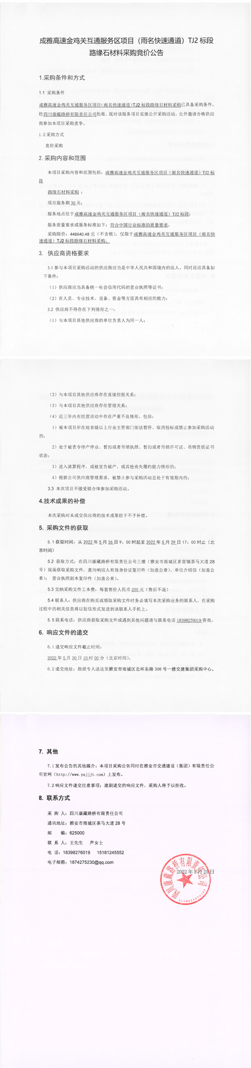 四川康藏路桥有限责任公司成雅高速金鸡关互通服务区项目(雨名快速通道)TJ2标段路缘石材料采购竞价公告