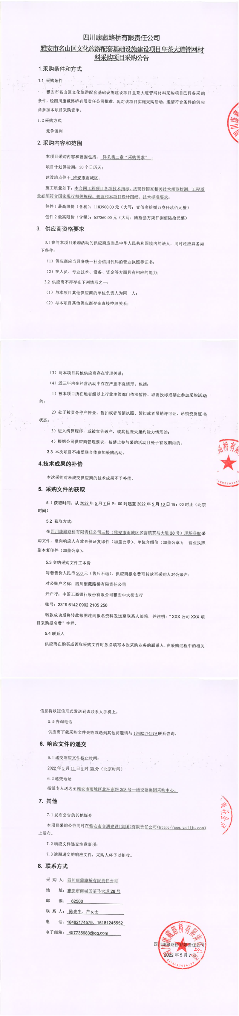 四川康藏路桥有限责任公司雅安市名山区文化旅游配套基础设施建设项目皇茶大道管网材料采购项目采购公告