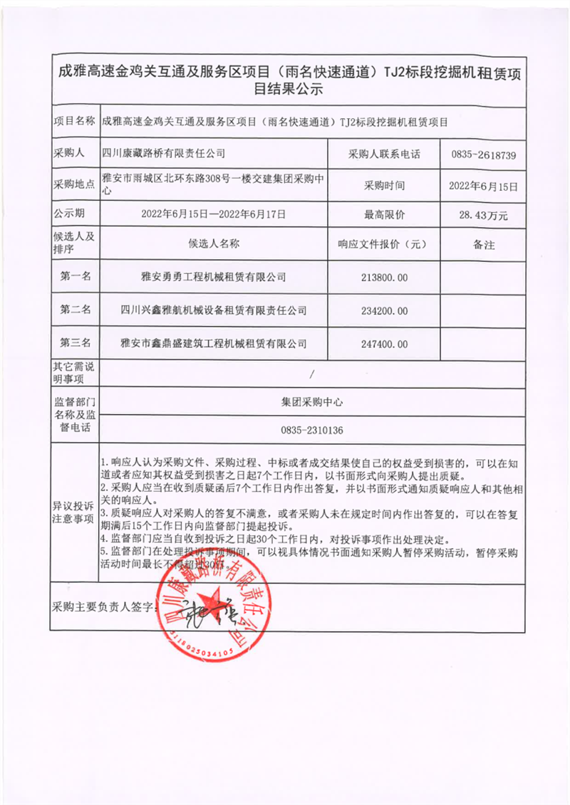 四川康藏路桥有限责任公司成雅高速金鸡关互通及服务区项目(雨名快速通道)TJ2标段挖掘机租赁项目结果公示