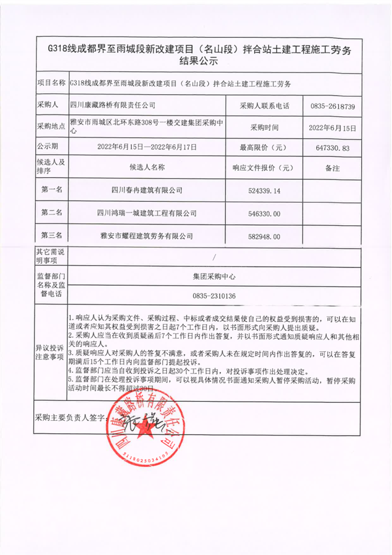 四川康藏路桥有限责任公司G318线成都界至雨城段新改建项目(名山段)拌合站土建工程施工劳务结果公示