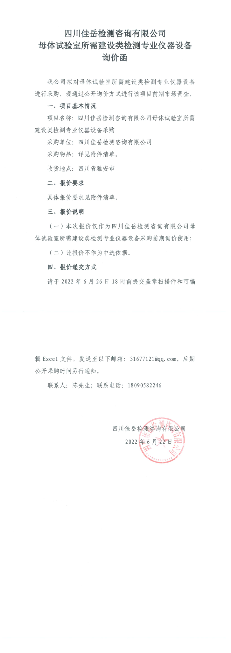 四川佳岳检测咨询有限公司母体试验室所需建设类检测专业仪器设备询价函