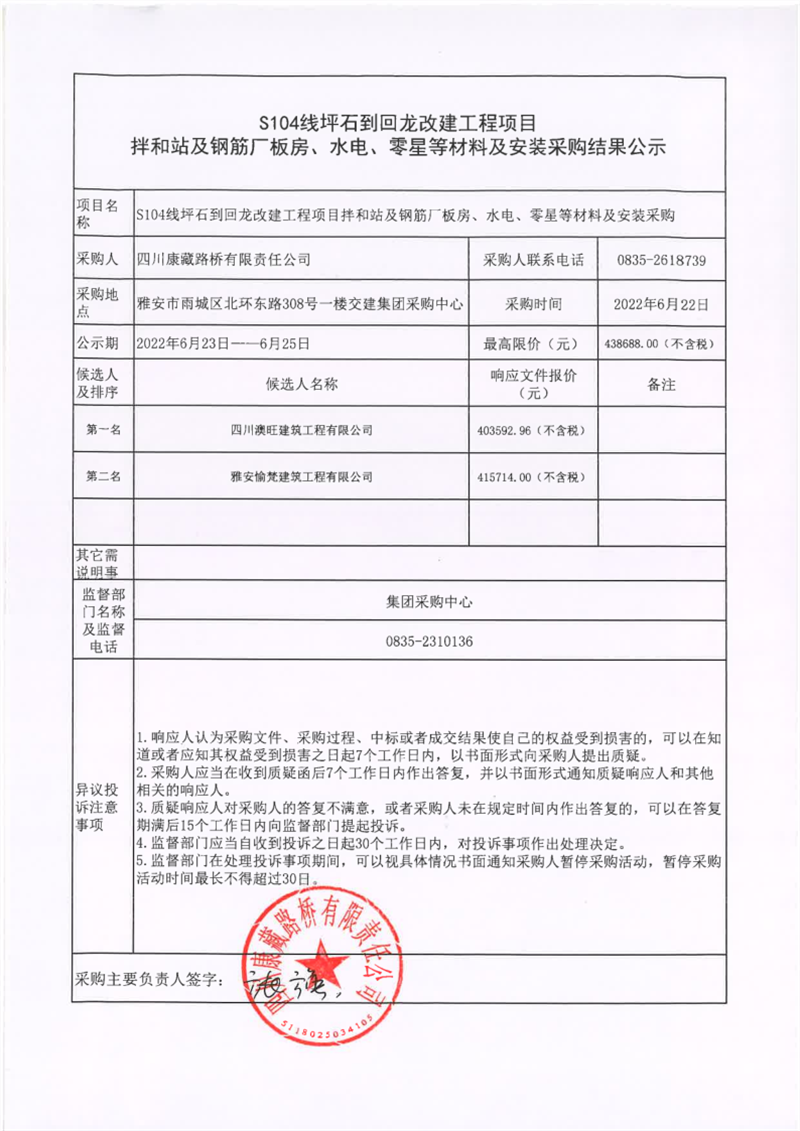 四川康藏路桥有限责任公司S104线坪石到回龙改建工程项目拌和站及钢筋厂板房、水电、零星等材料及安装采购结果公示