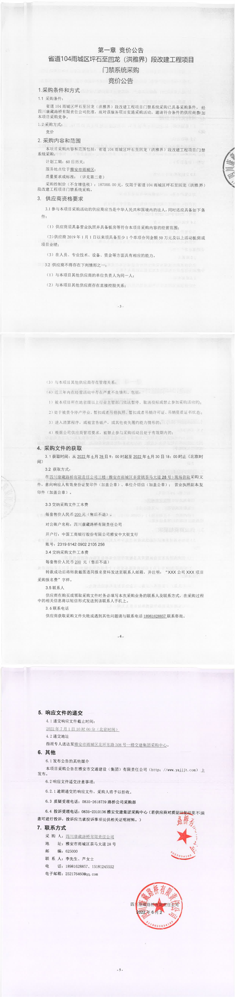 四川康藏路桥有限责任公司省道104雨城区坪石至回龙(洪雅界)段改建工程项目门禁系统采购