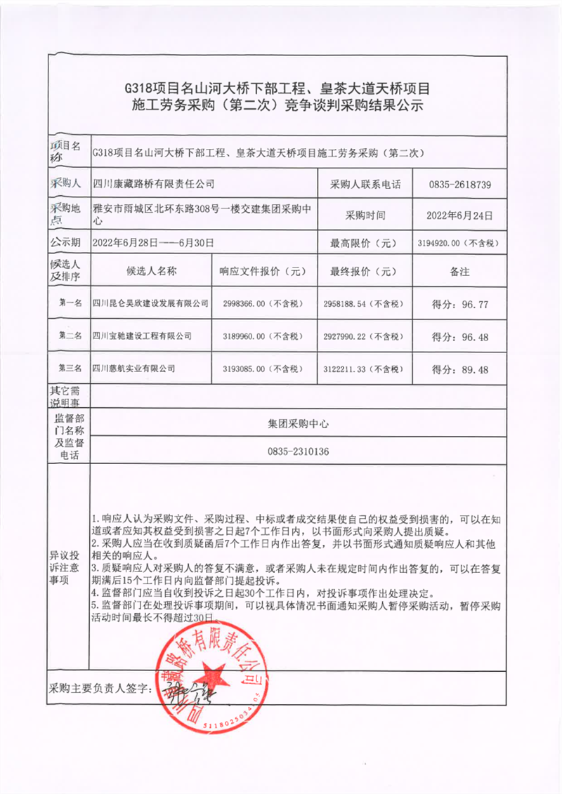 四川康藏路桥有限责任公司G318项目名山河大桥下部工程、皇茶大道天桥项目施工劳务采购(第二次)竞争谈判采购结果公示