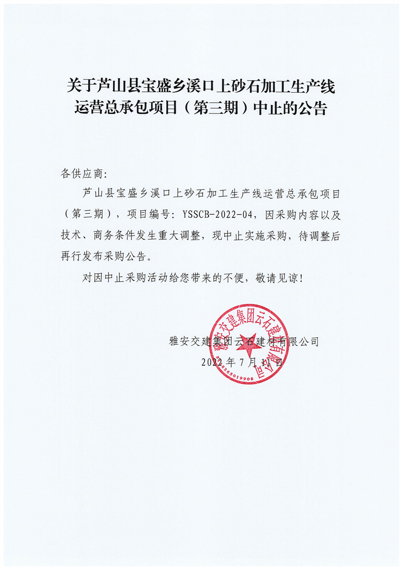 亿万先生MR集团云石建材有限公司关于芦山县宝盛乡溪口上砂石加工生产线运营总承包项目(第三期)中止的公告