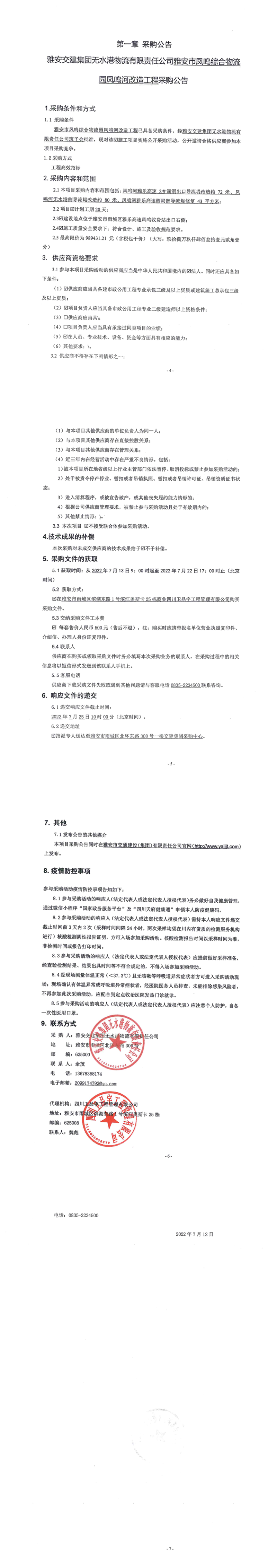 亿万先生MR集团无水港物流有限责任公司雅安市凤鸣综合物流园凤鸣河改造工程采购公告