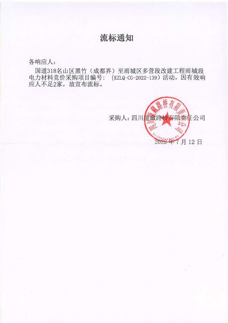 四川康藏路桥有限责任公司国道318名山区黑竹(成都界)至雨城区多营段改建工程雨城段电力材料竞价采购项目流标通知