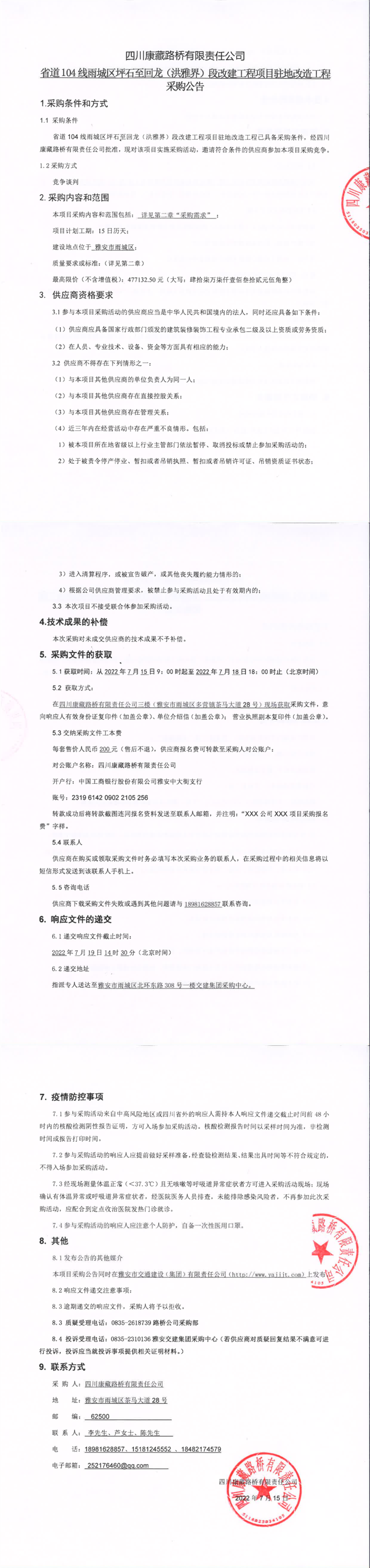 四川康藏路桥有限责任公司省道104线雨城区坪石至回龙(洪雅界)段改建工程项目驻地改造工程采购公告