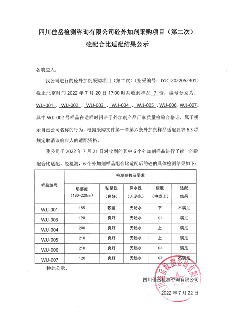 四川佳岳检测咨询有限公司砼外加剂采购项目(第二次)砼配合比适配结果公示