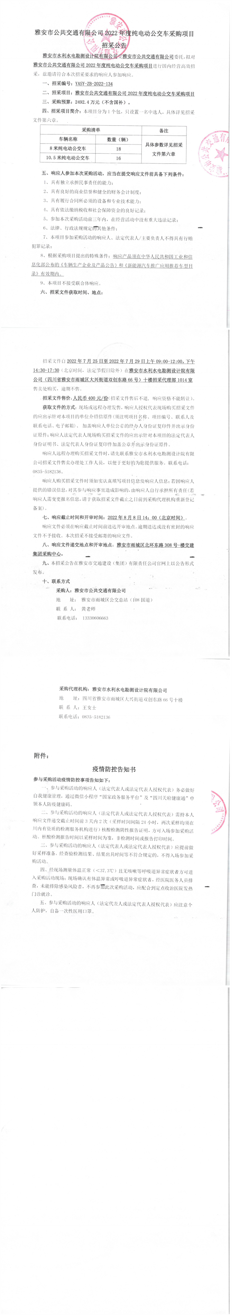 雅安市公共交通有限公司2022年度纯电动公交车采购项目招采公告