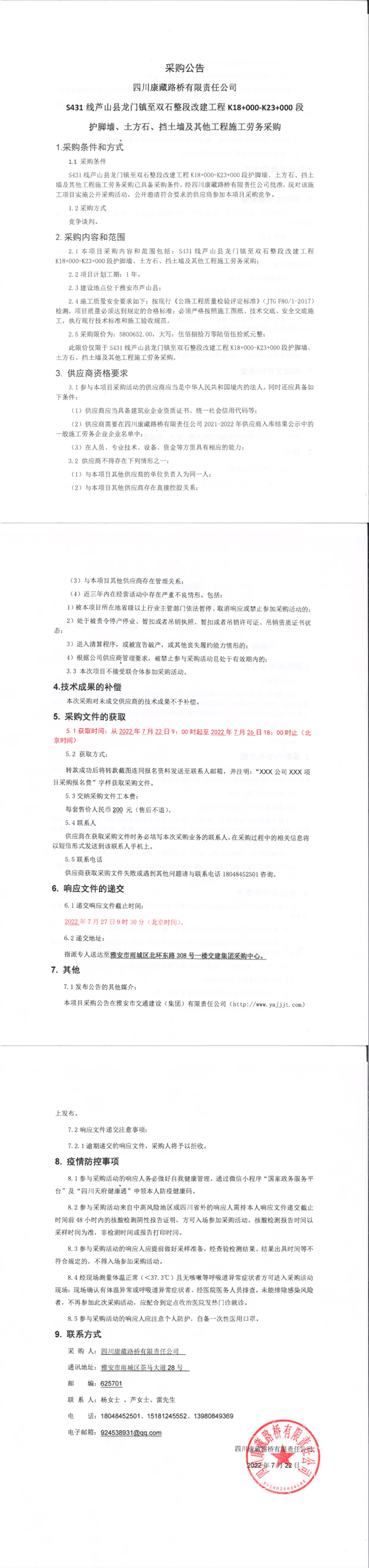 四川康藏路桥有限责任公司S431线芦山县龙门镇至双石整段改建工程K18+000-K23+000段护脚墙、土方石、挡土墙及其他工程施工劳务采购
