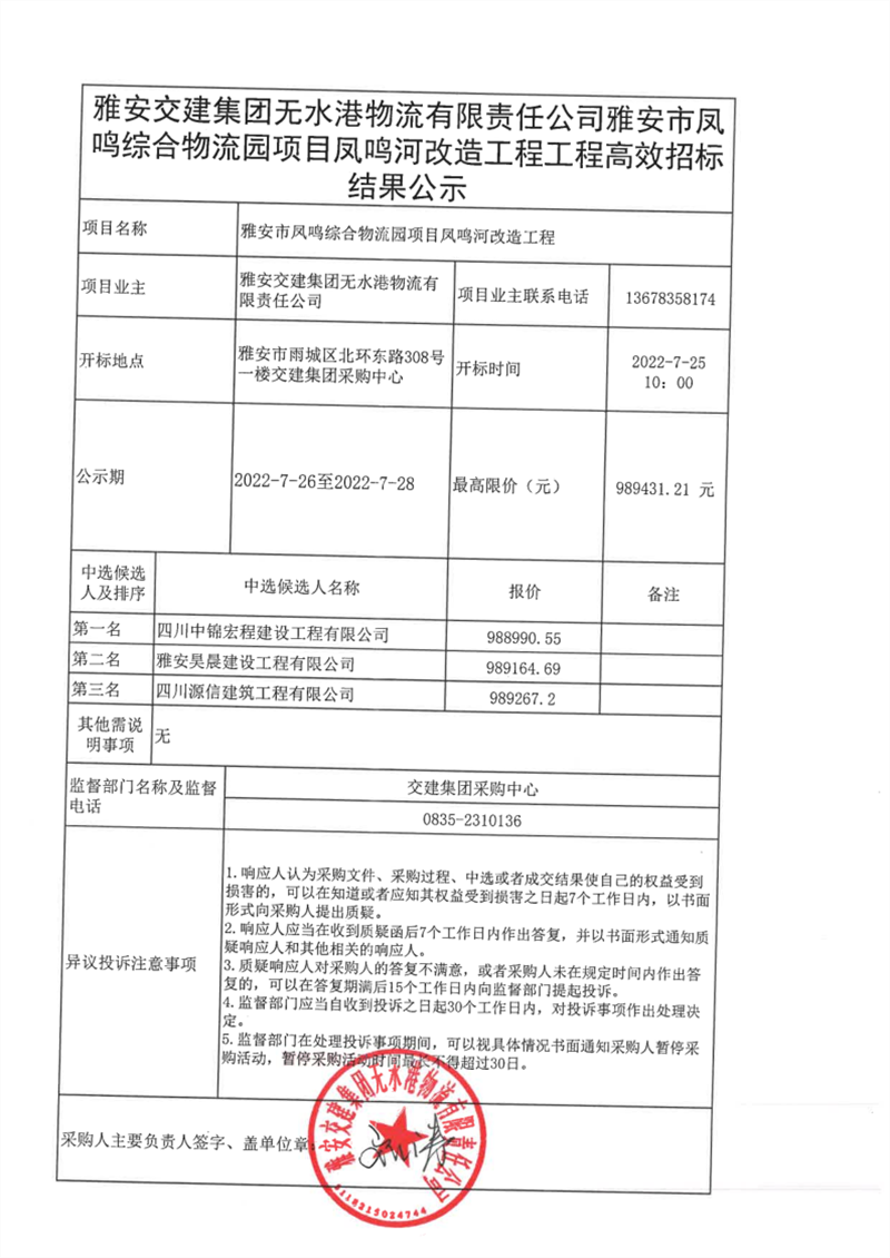亿万先生MR集团无水港物流有限责任公司雅安市凤鸣综合物流园凤鸣河改造工程工程高效招标结果公示