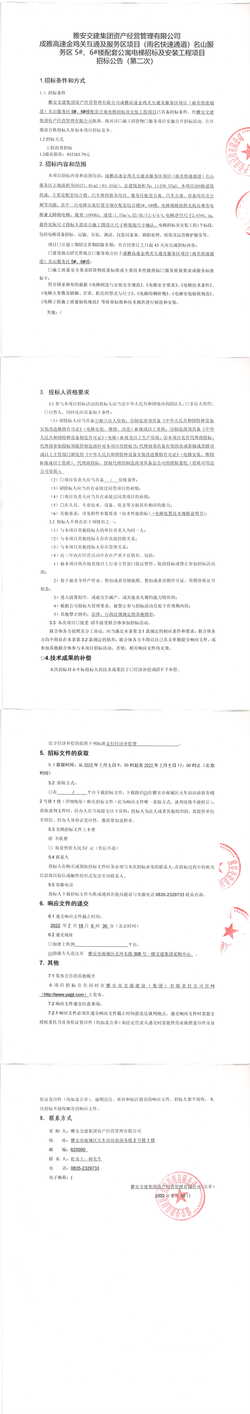 亿万先生MR集团资产经营管理有限公司成雅高速金鸡关互通及服务区项目(雨名快速通道)名山服务区5#、6#楼配套公寓电梯招标及安装工程项目招标公告(第二次)