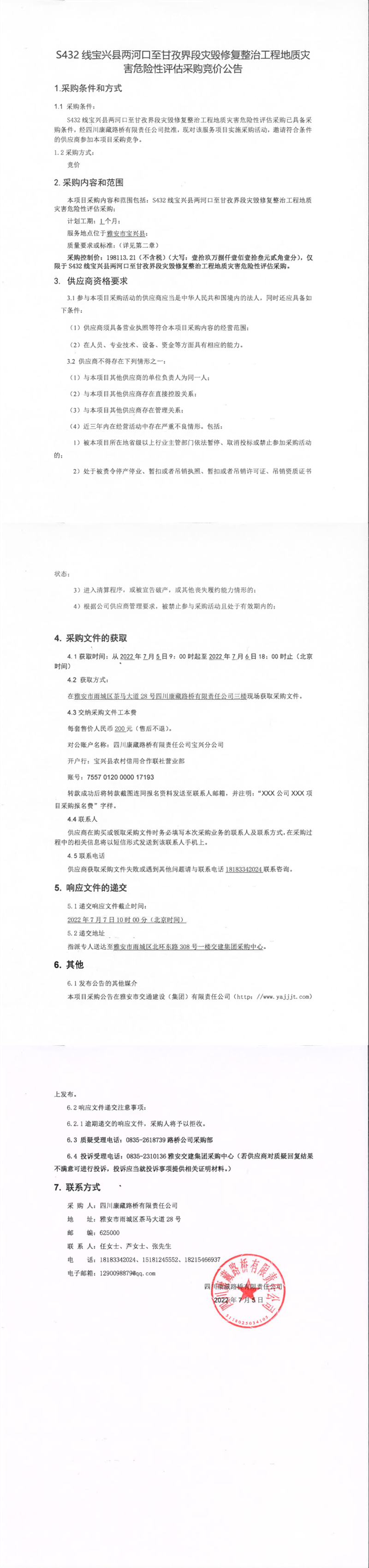 四川康藏路桥有限责任公司S432线宝兴县两河口至甘孜界段灾毁修复整治工程地质灾害危险性评估采购竞价公告