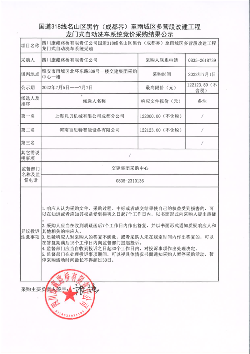 四川康藏路桥有限责任公司国道318名山区黑竹(成都界)至雨城区多营段改建工程龙门式自动洗车系统竞价采购结果公示