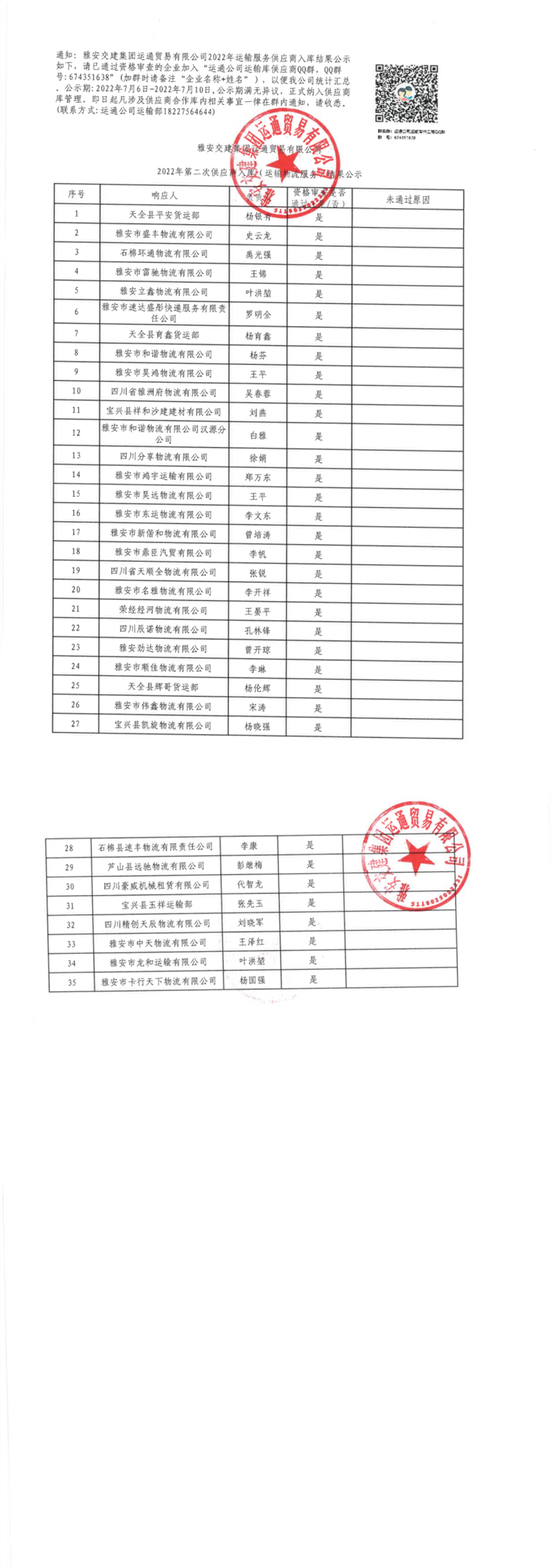亿万先生MR集团运通贸易有限公司2022年第二次供应商入库(运输物流服务)结果公示