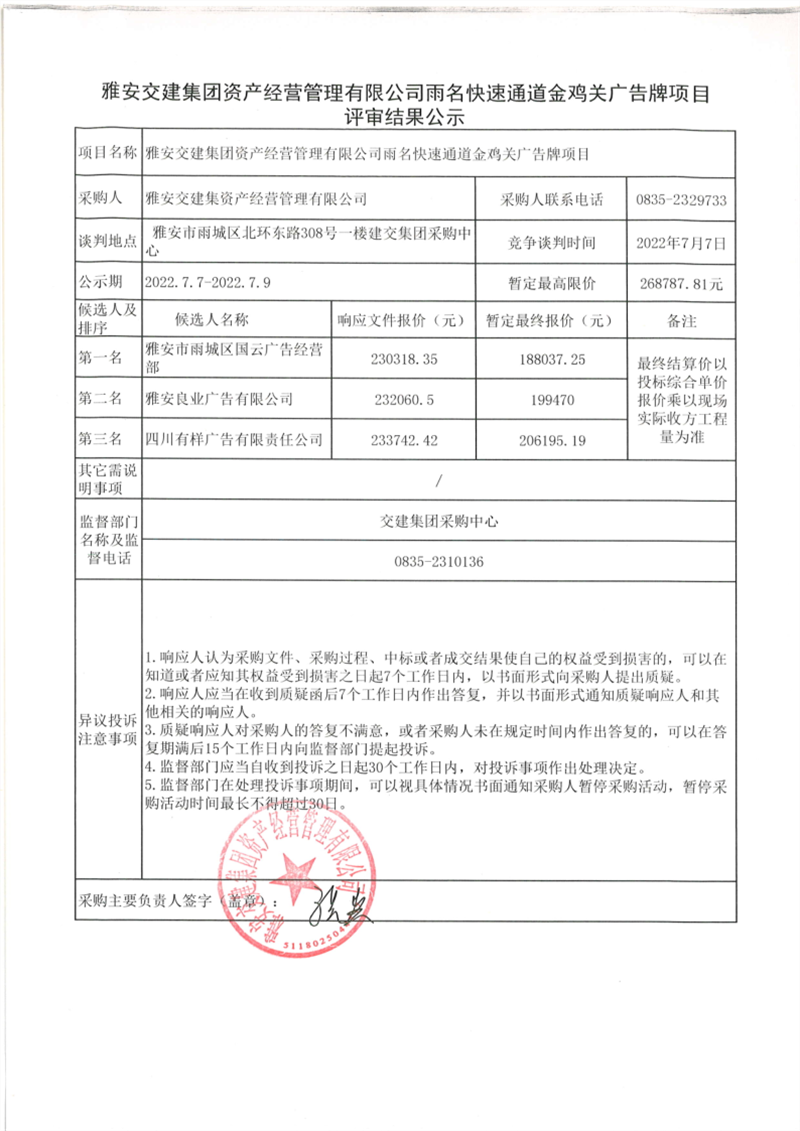 亿万先生MR集团资产经营管理有限公司雨名快速通道金鸡关广告牌项目评审结果公示
