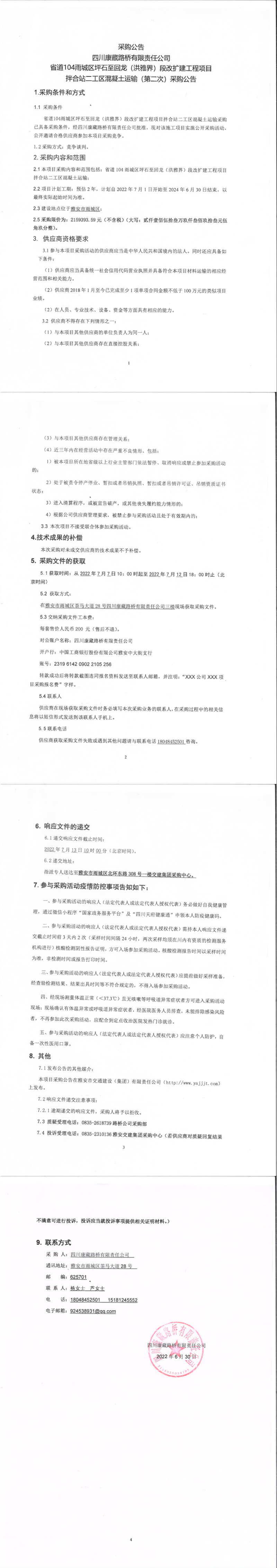 四川康藏路桥有限责任公司省道104雨城区坪石至回龙(洪雅界)段改建工程项目拌合站二工区混凝土运输(第二次)采购公告