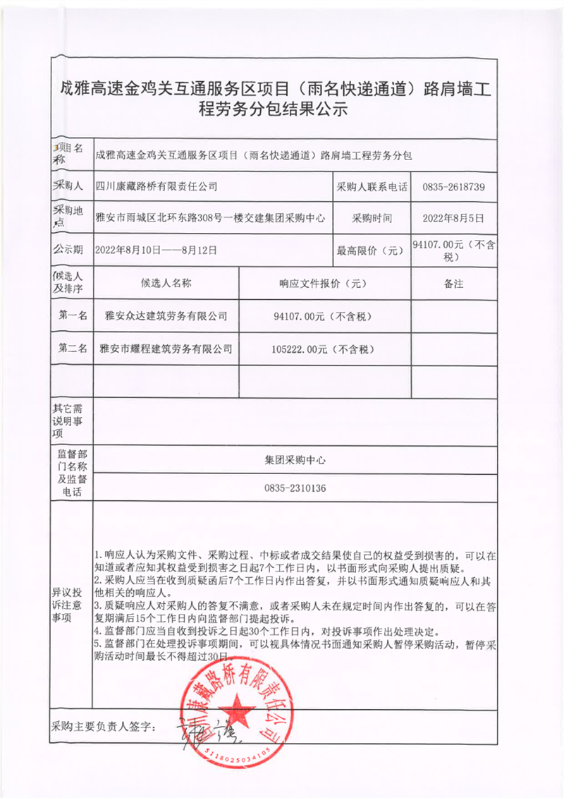 四川康藏路桥有限责任公司成雅高速金鸡关互通服务区项目(雨名快速通道)路肩墙工程劳务分包结果公示
