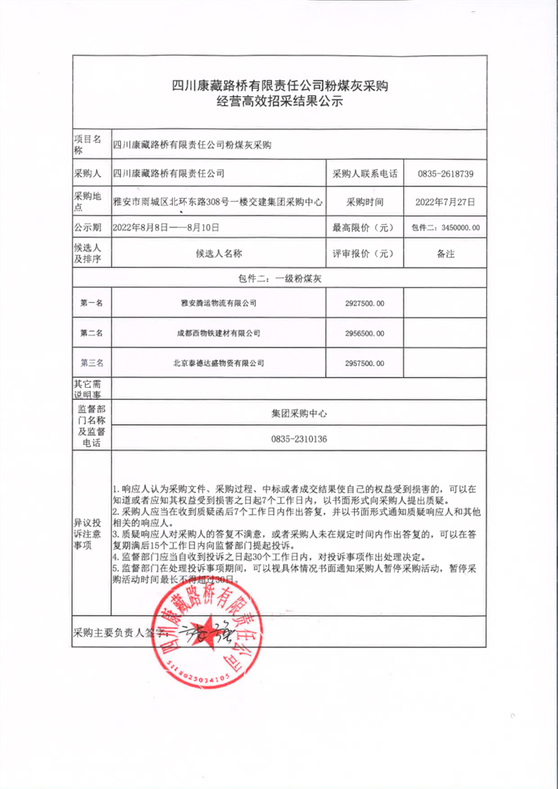 四川康藏路桥有限责任公司粉煤灰采购经营高效招采结果公示