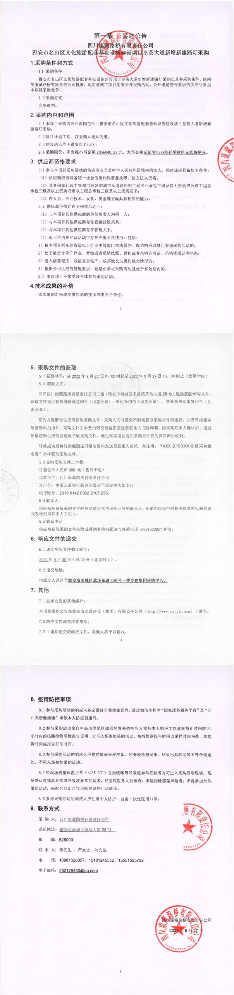 四川康藏路桥有限责任公司雅安市名山区文化旅游配套基础设施建设项目皇茶大道新增新建路灯采购公告