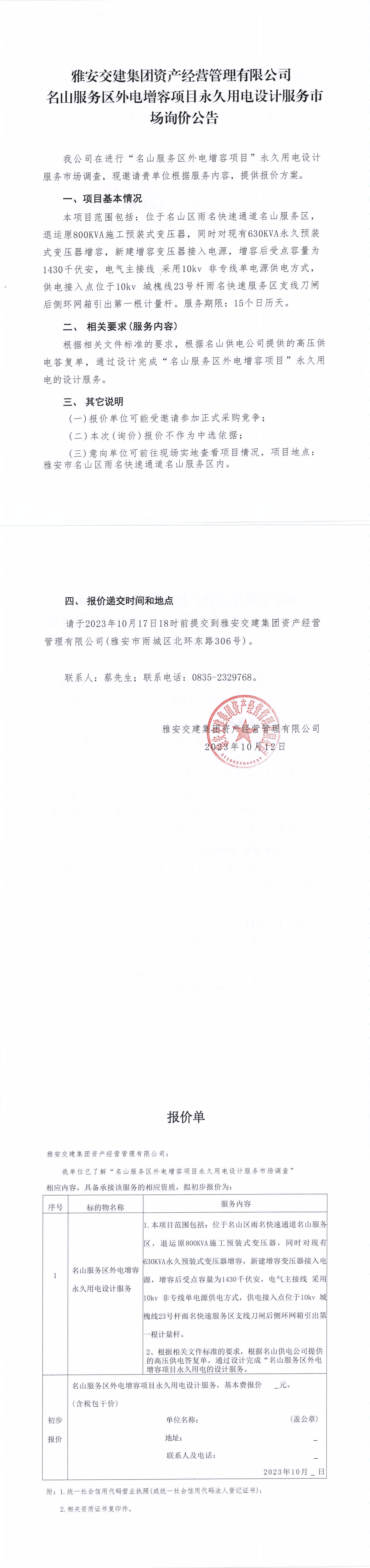 亿万先生MR集团资产经营管理有限公司名山服务区外电增容项目永久用电设计服务市场询价公告