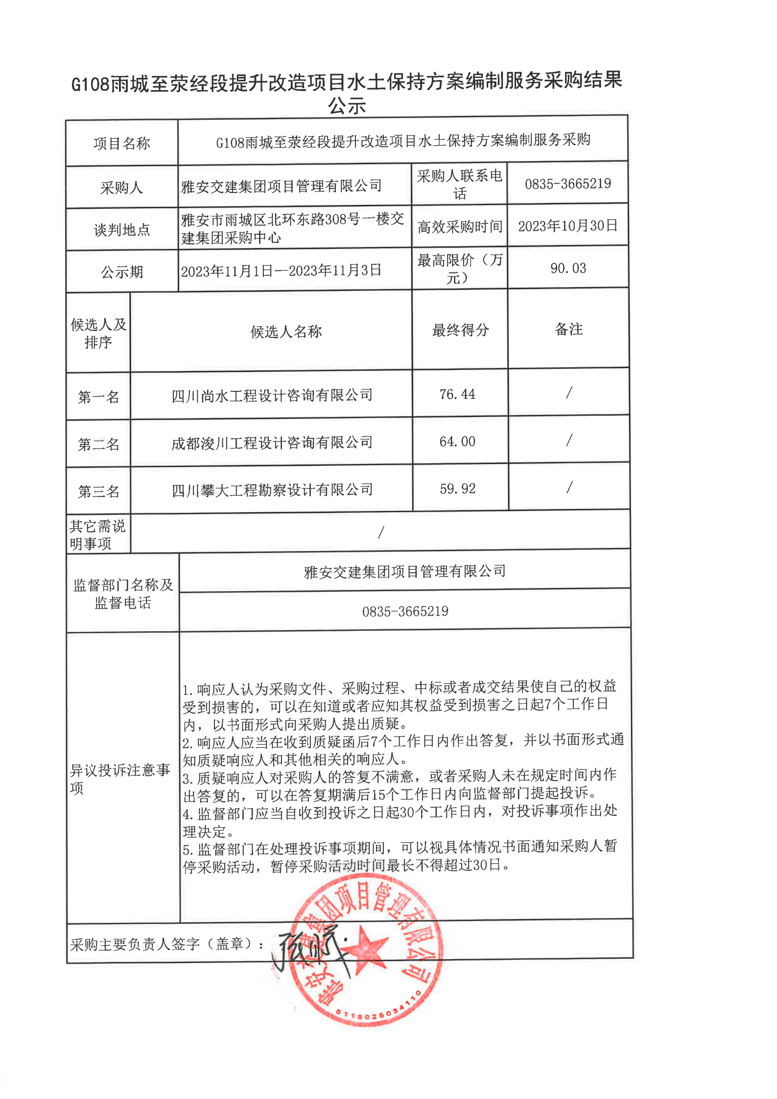 亿万先生MR集团项目管理有限公司G108雨城至荥经段提升改造项目水土保持方案编制服务采购结果公示