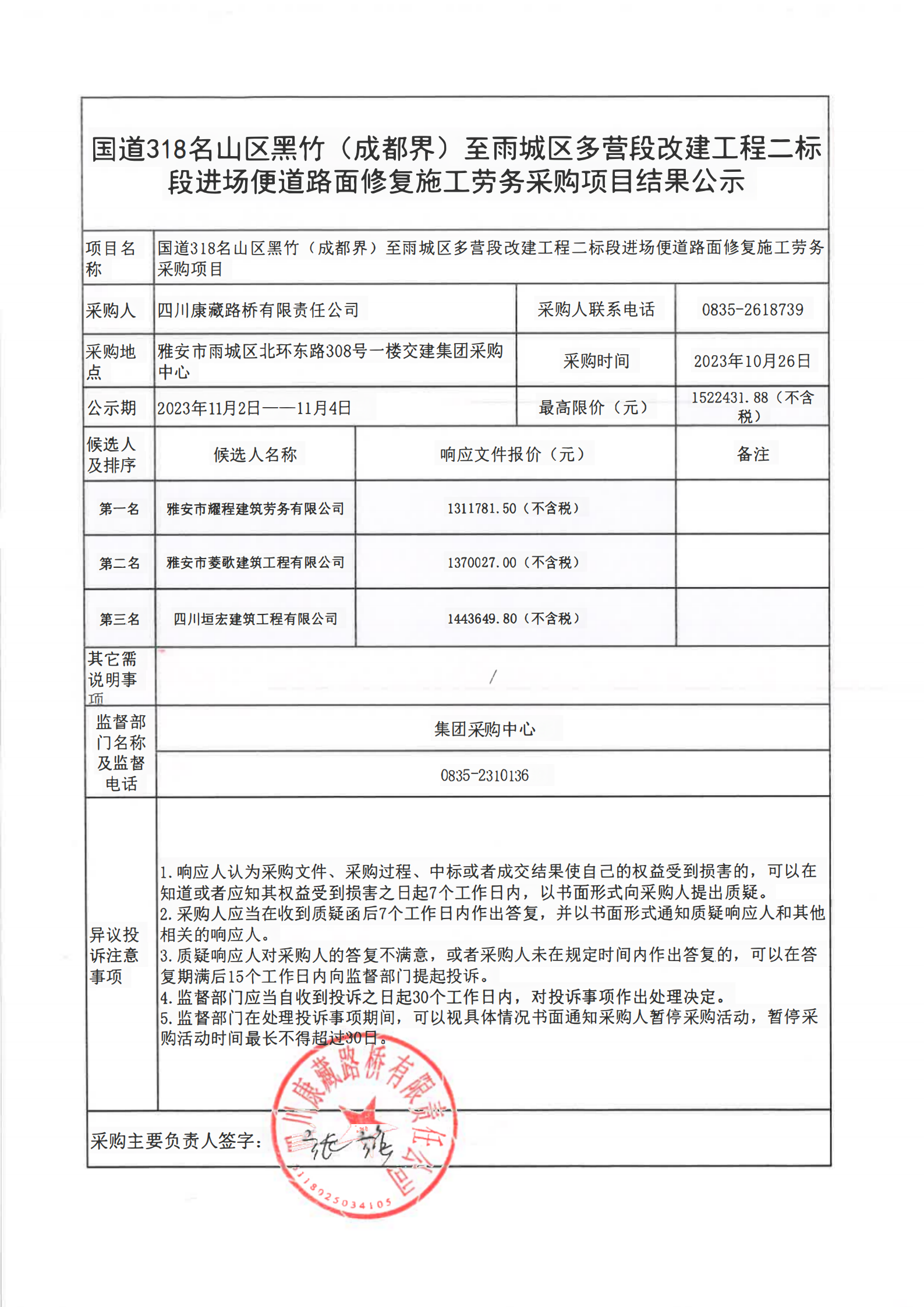四川康藏路桥有限责任公司国道318名山区黑竹(成都界)至雨城区多营段改建工程二标段进场便道路面修复施工劳务采购项目结果公示