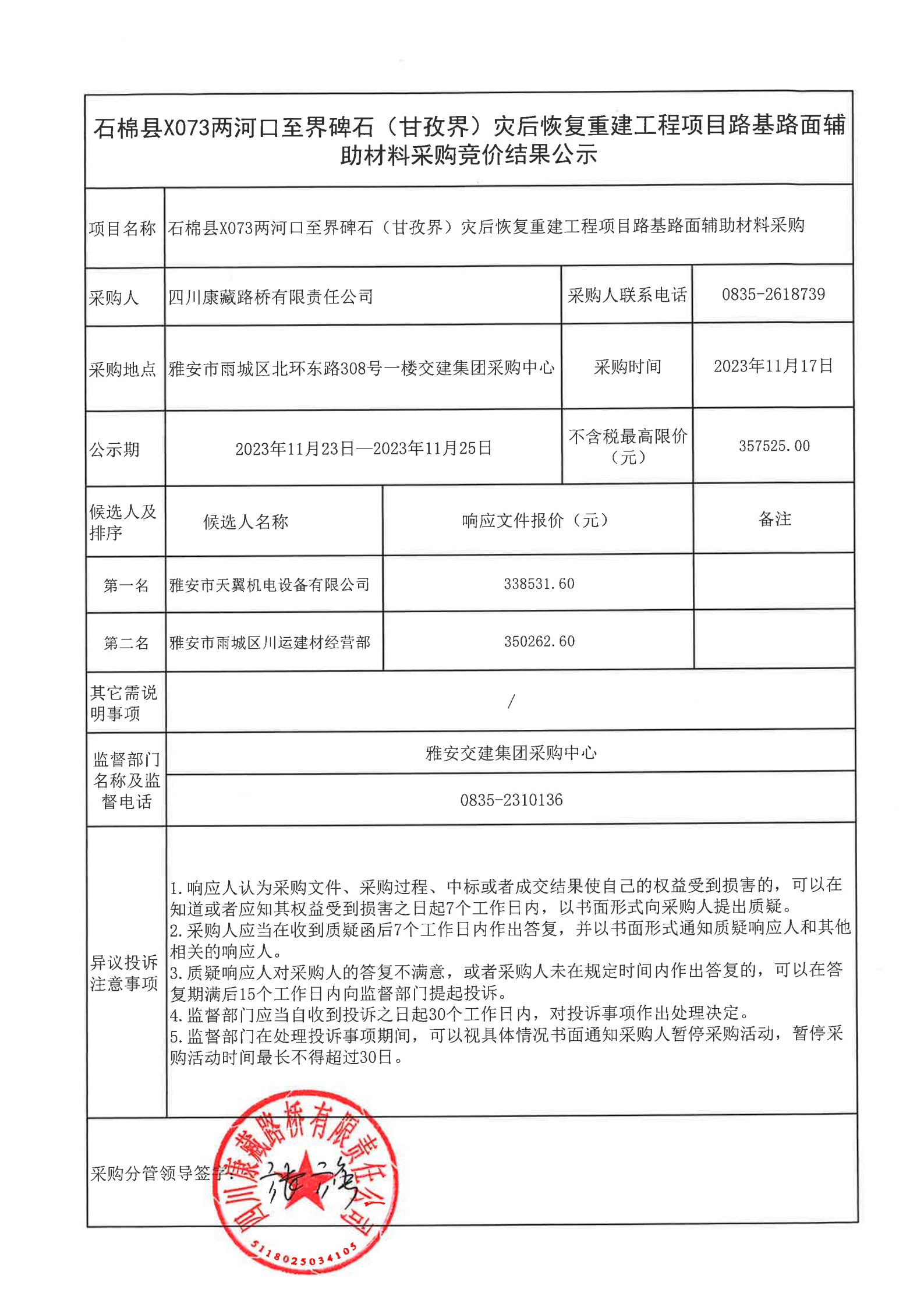 四川康藏路桥有限责任公司石棉县X073两河口至界碑石(甘孜界)灾后恢复重建工程项目路基路面辅助材料采购结果公示