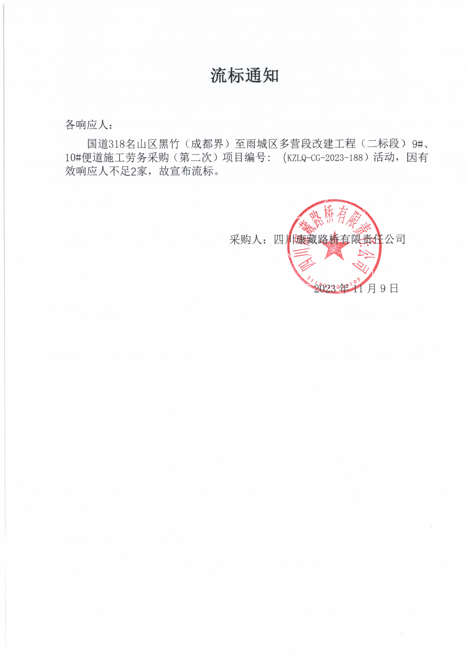 四川康藏路桥有限责任公司国道318名山区黑竹(成都界)至雨城区多营段改建工程二标段9#、10#便道施工劳务采购(第二次)流标通知