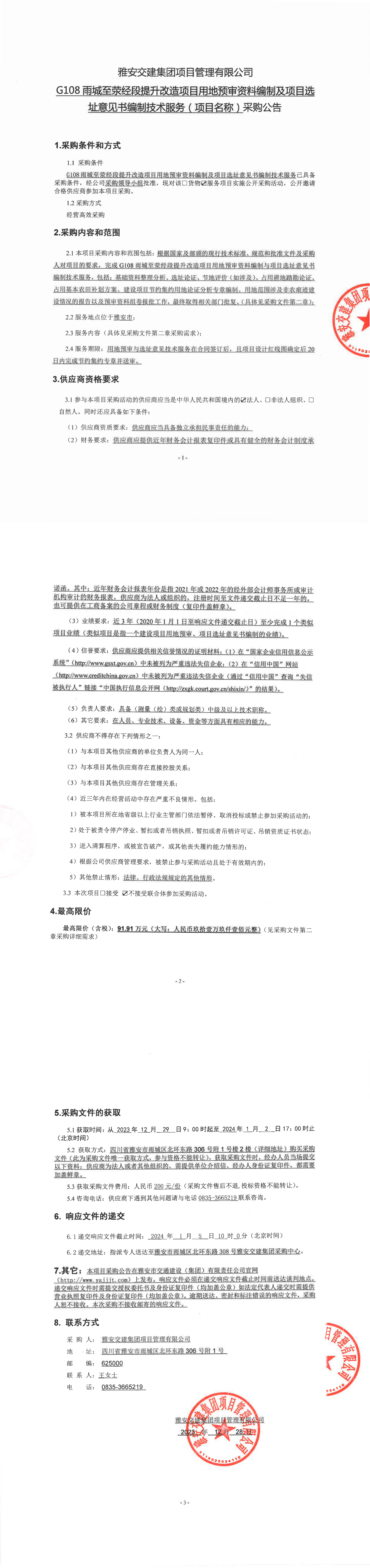 亿万先生MR集团项目管理有限公司G108雨城至荥经段提升改造项目用地预审资料编制及项目选址意见书编制技术服务(项目名称)采购公告