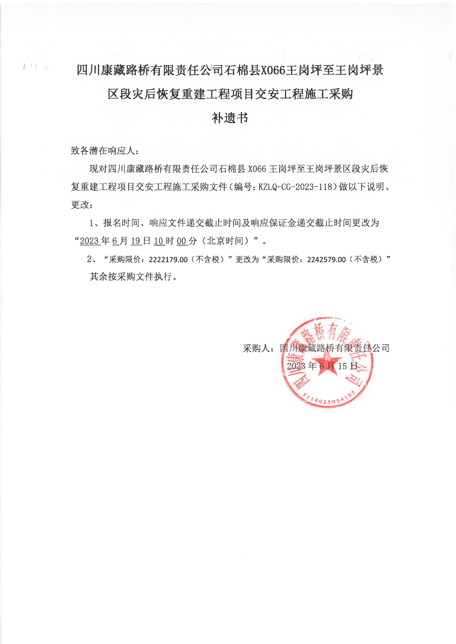 四川康藏路桥有限责任公司石棉县X066王岗坪至王岗坪景区段灾后恢复重建工程项目交安工程施工补遗书