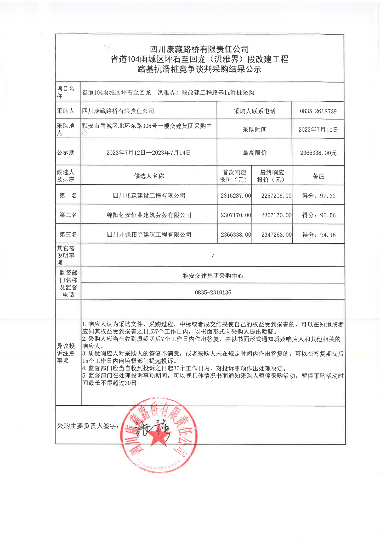 四川康藏路桥有限责任公司省道104雨城区坪石至回龙(洪雅界)段改建工程路基抗滑桩竞争谈判采购结果公示