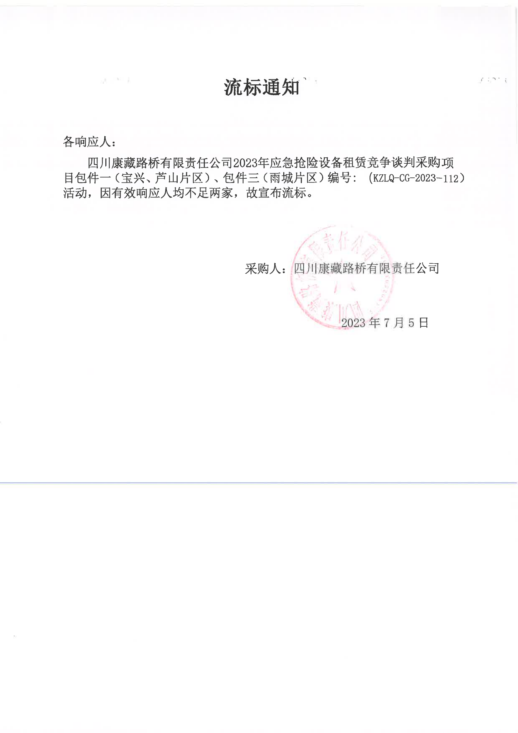 四川康藏路桥有限责任公司2023年应急抢险设备租赁竞争谈判采购项目包件一(宝兴、芦山片区)、包件三(雨城片区)流标通知