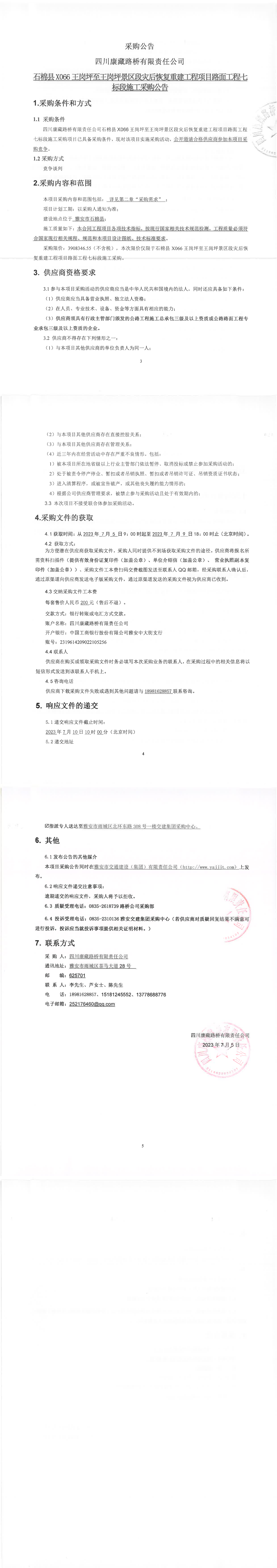 四川康藏路桥有限责任公司石棉县X66X王岗坪景区段灾后恢复重建工程项目路面工程七标段施工采购公告