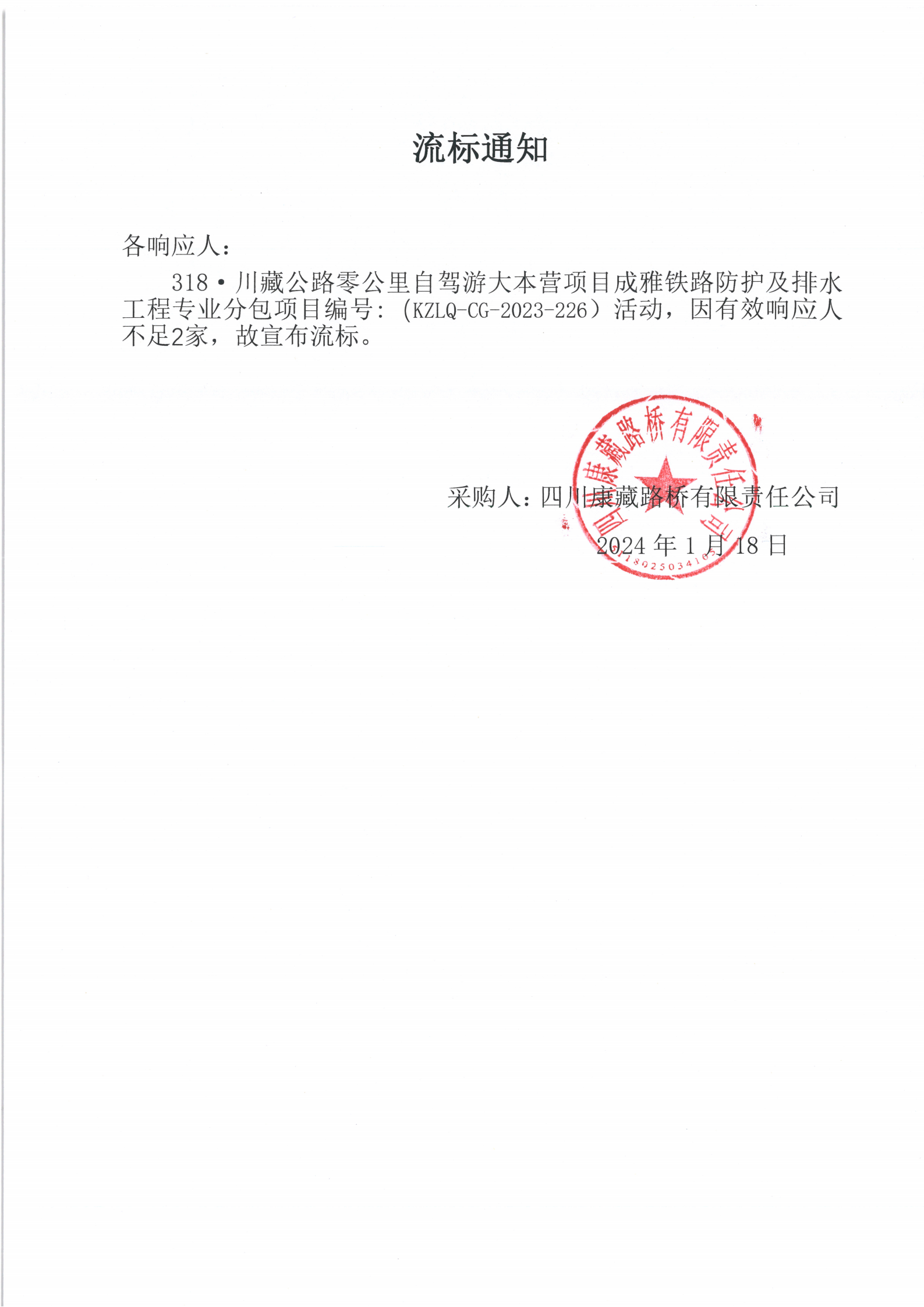 四川康藏路桥有限责任公司318·川藏公路零公里自驾游大本营项目成雅铁路防护及排水工程专业分包项目流标通知