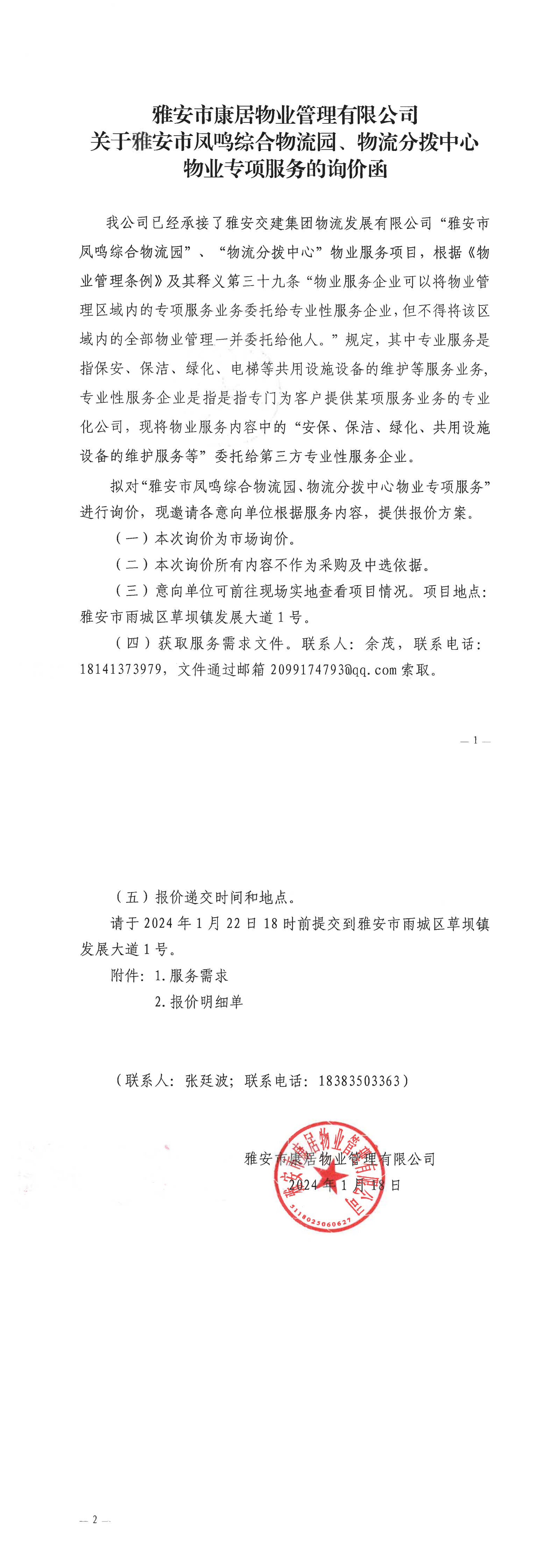 雅安市康居物业管理有限公司关于雅安市凤鸣综合物流园、物流分拨中心物业专项服务的询价函
