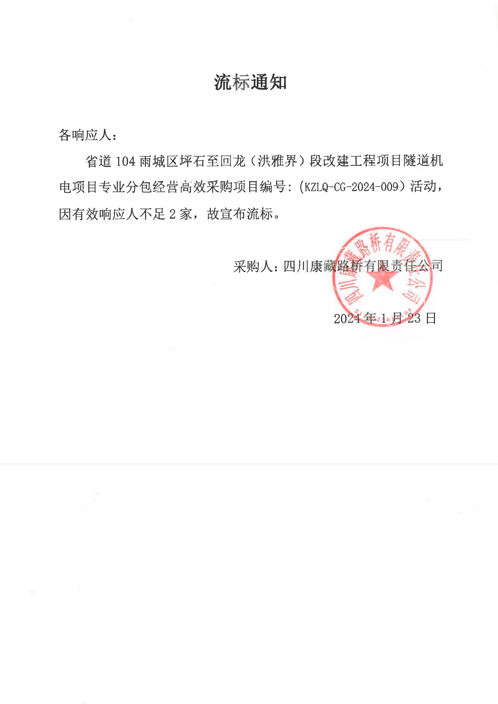 四川康藏路桥有限责任公司省道104雨城区坪石至回龙(洪雅界)段改建工程项目隧道机电项目专业分包经营高效采购流标通知