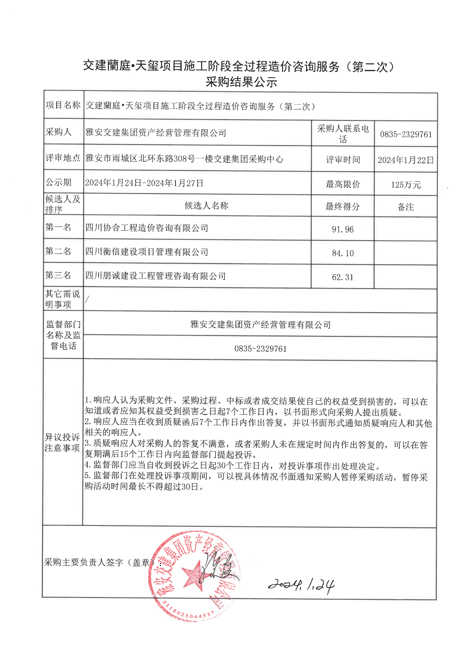 亿万先生MR集团资产经营管理有限公司交建蘭庭·天玺项目施工阶段全过程造价咨询服务(第二次)采购结果公示