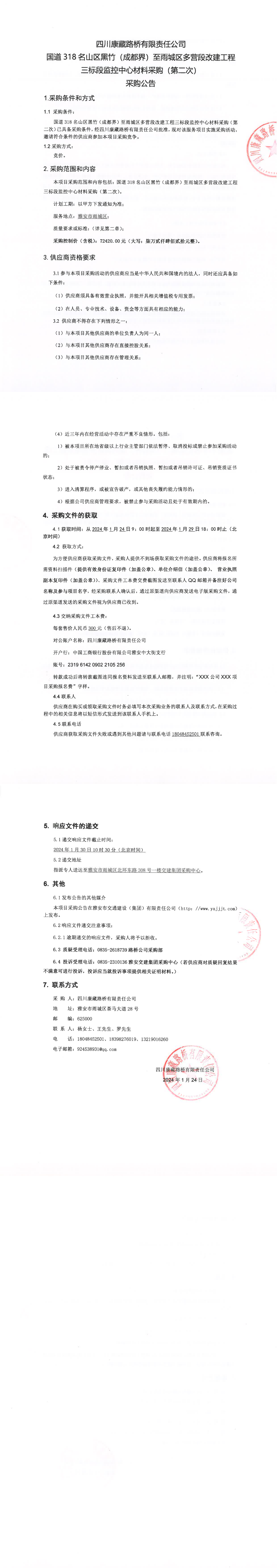 四川康藏路桥有限责任公司国道318名山区黑竹(成都界)至雨城区多营段改建工程三标段监控中心材料采购(第二次)采购公告