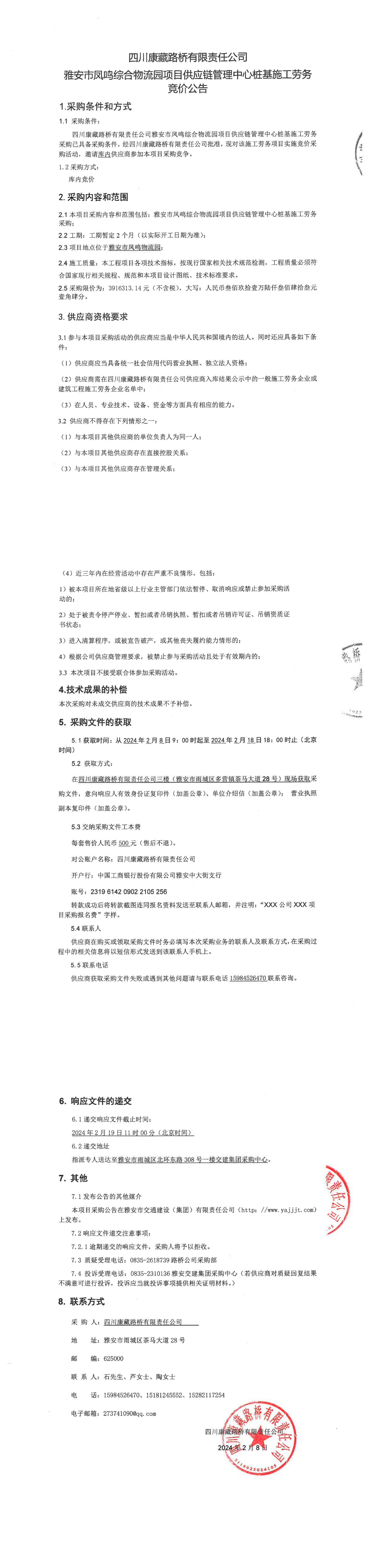 四川康藏路桥有限责任公司雅安市凤鸣综合物流园项目供应链管理中心桩基施工劳务采购公告