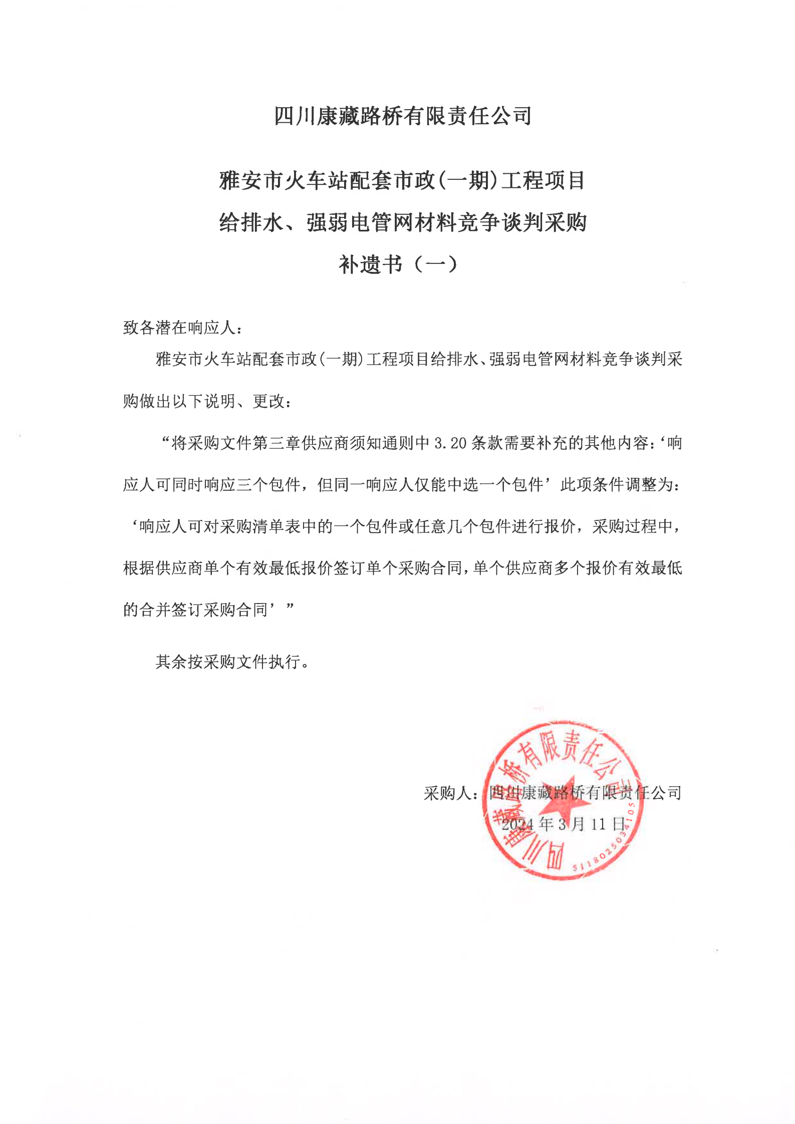 四川康藏路桥有限责任公司雅安市火车站配套市政(一期)工程项目给排水、强弱电管网材料竞争谈判采购补遗书