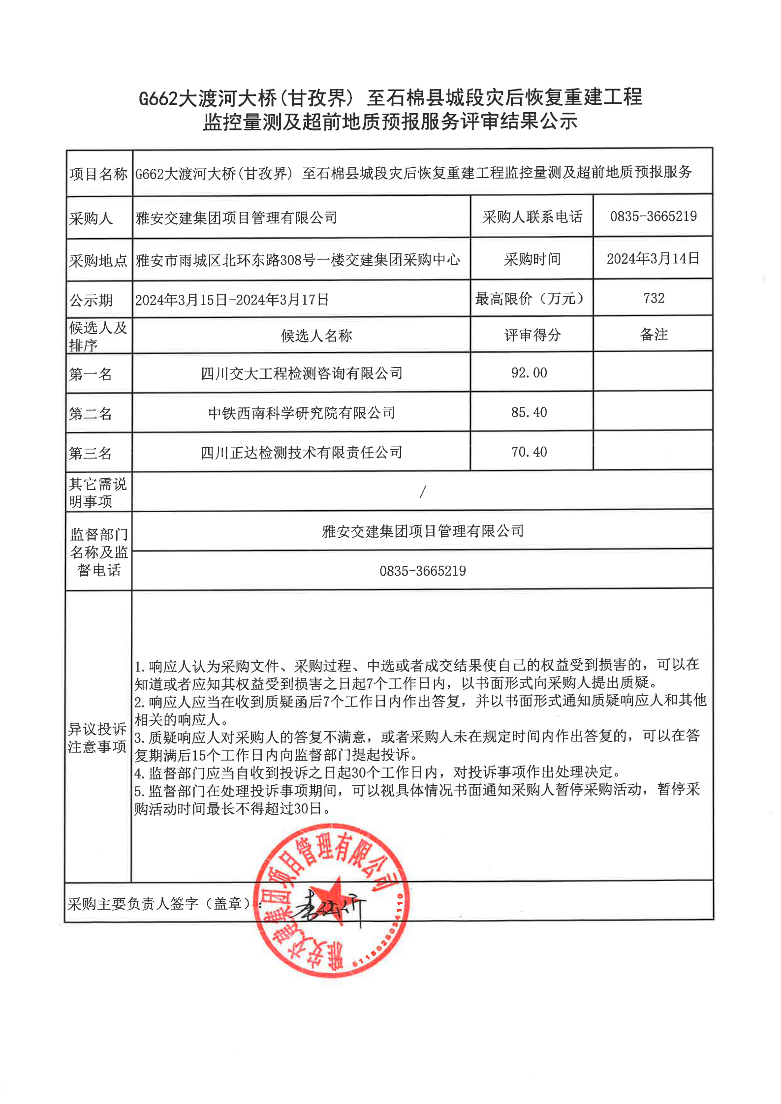 亿万先生MR集团项目管理有限公司G662大渡河大桥(甘孜界)至石棉县城段灾后恢复重建工程监控量测及超前地质预报服务评审结果公示
