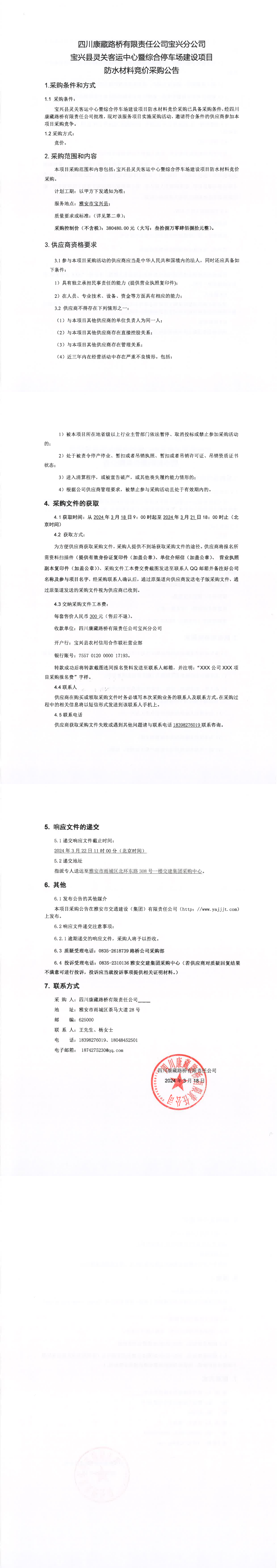 四川康藏路桥有限责任公司宝兴县灵关客运中心暨综合停车场建设项目防水材料竞价采购公告